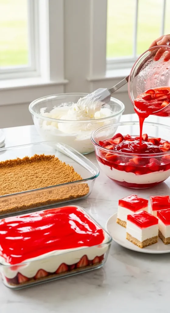 Crunchy pretzel crust. Creamy, dreamy middle. Bright strawberry top that jiggles just enough to feel fancy. Let’s make it.