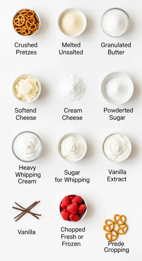 Mix crushed pretzels, 3 tbsp sugar, and melted butter in a bowl. Press it firmly into the bottom of your pan. Bake for 10 minutes until golden. Pro tip: don’t skip pressing it tightly—you want a sturdy base. Let it cool. - Cream cheese layer