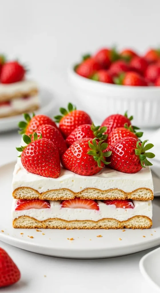Arrange the strawberry slices neatly over the cream cheese layer. You can make it fancy or messy—I’m not your boss. - Chill time!
