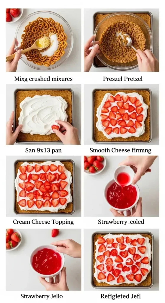 - Crust Time: Preheat oven to 350°F (175°C). Mix crushed pretzels, melted butter, and sugar in a bowl until it looks like wet sand. Press firmly into a 9×13 pan. Bake for 10 minutes. Let it cool completely, you don’t want molten cream cheese disaster.